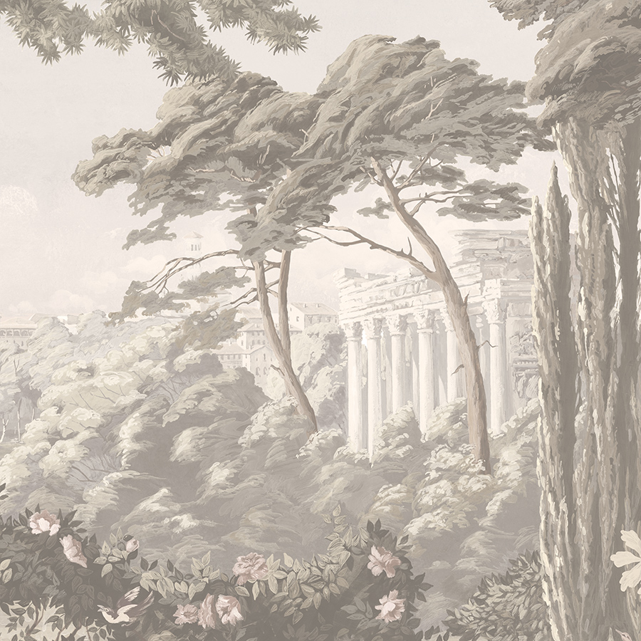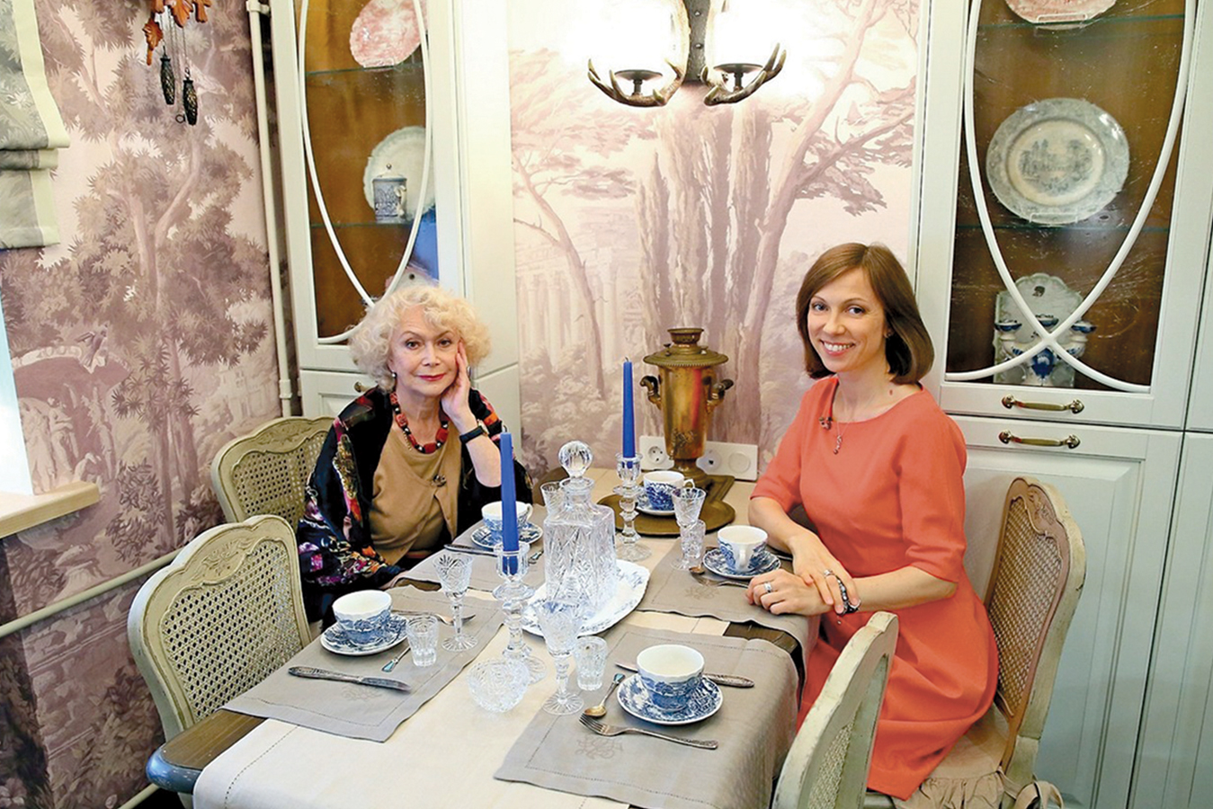 Under the numerous collections of actress Svetlana Nemolyaeva from porcelain, figurines, icons, and other ancient objects, the designer laid the foundation for the interior of the idea of an antique park. For this, the walls of the kitchen, hall and corridors were decorated with a panoramic landscape from the Wallpaper part 2 catalog, арт. AF742-COL4. The picturesque drawing became a harmonious background, which, thanks to its noble and calm colors, combined all the objects of the actress's collection into a single whole. The color of the picture was slightly changed to shades of sepia on the instructions of the project author Anna Smirnova.