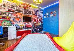 Bright and vibrant interior for a boy with his favorite characters from the animated film Disney / Pixar «Cars» was created using Affresco frescoes from the children's collection (art. 9664).