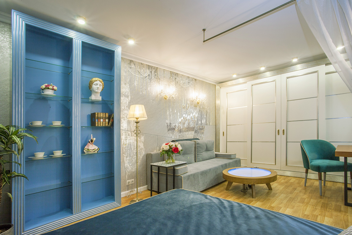 Wallpapers from the collection New Art decorated the bedroom of the actress and fashion model - Yelena Metelkina. The main idea of the interior is the creation of a cozy ladies' boudoir, filled with light, brilliance of crystal and mirrors. The main decor, which expressed the concept of the designer, was a modern collage from the collection New Art (art. RE182-COL1), which was taken as a basis for the preparation of an individual sketch. A drawing with elements of painted crystal chandeliers flickering with light served as a delicate decoration, giving the interior a palace decorativeness and individuality. In addition to the wallpaper background companion wallpapers are made. They are made using the same technology: manually using plaster, so they perfectly fit together. The absence of joints on the plane of the walls makes their surface flawlessly flat and homogeneous.