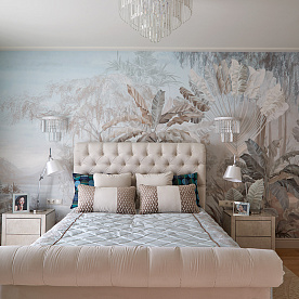 Panoramic wallpaper from the new collection VESNA became the main ideological component in the unusually soft and romantic interior of Irina Irina Bezrukova's bedroom - a well-known actress of the theater, cinema and TV presenter. The exotic landscape (Art. AB128-COL1) was created by the artists of the Affresco factory during a long and painstaking work on every detail. Translucent transitions of the color of watercolor techniques are very accurately transferred to the Velure canvas with a rough layer of plaster. Seamless wallpaper VESNA created in the interior of the actress a feeling of hand-painted mural. The air landscape with a deep perspective widened the space of the bedroom, filled it with light and a romantic mood.