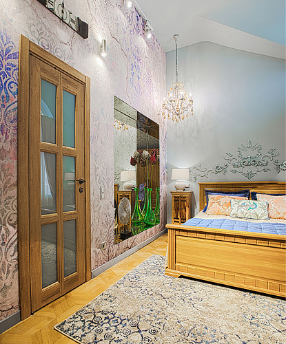Handmade wallpaper RE-SPACE decorated Moscow apartment of Alexander Ghalibin, famous soviet and Russian actor, director, and TV host of the 1st Channel. Two designs from the new collection RE-SPACE were placed on the bedroom wall and on the balcony. Vintage themes (Арт. JV100-COL3 и ID103-COL1) created an effect of aged walls, where the image slightly faded, and the plaster teared down and cracked. The vintage charm, created by murals, supported the classical style of the interior. The frescoes were set up seamless, and the doors and windows were cut out afterwards. Such technique created a perfectly smooth and even surface.
