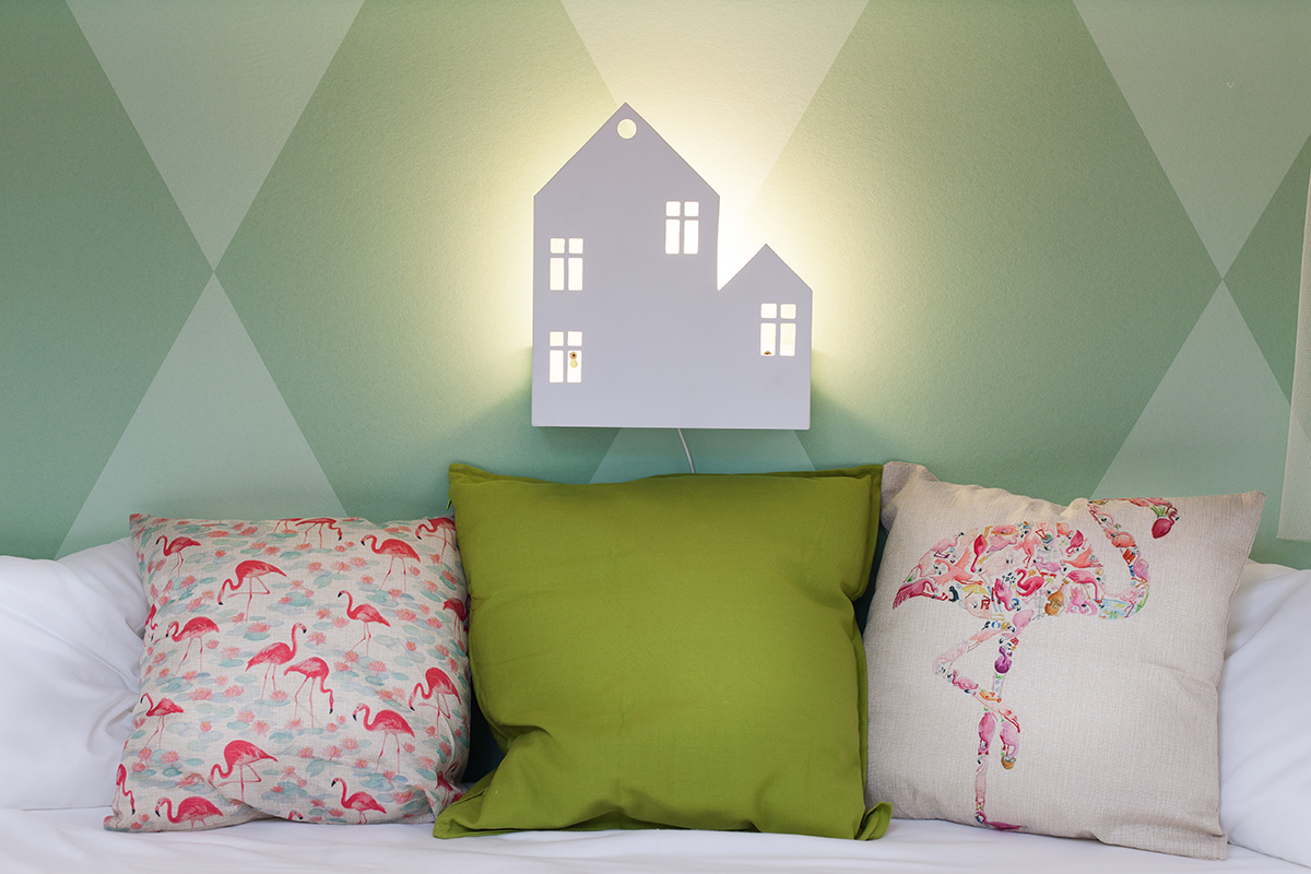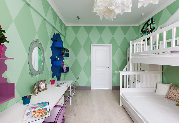 Seamless murals with pale green rhombuses covered all the walls of children's rooms and created a fabulous space inspired by the fairy tale "Alice in Wonderland." While preparing the sketch it was important to make an image naturally flow from one wall to the other and harmoniously joined with the first panel. Magic showed itself in two small parts on one of the frescoes: a rabbit and a hat, which seemed to appear suddenly above the cabinets. Detail of the sketch were placed in a certain distance from the floor so that after the furniture was arranged they were clearly above the cabinet on either side of the wall. Murals are made on a velvety texture Velure. With Affresco frescoes, well-planned according to the size of the furniture and walls, it managed to create a peaceful and attractive space with a magical fairy-tale mood.