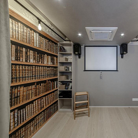 An unusual design technique of placing the fake cabinets instead of the real ones became the basis of the entire design project of the new living room. This idea was brought to reality with the use of customized murals. Creating the sketch the designers of Affresco factory followed the task thoroughly, observing the height and number of shelves, selected photographs of old books and arranged them so that there would be no visible repetitions. Murals were developed taking into account the real proportions of the cabinet and the books themselves. With such approach Affresco designers managed to achieve maximum realism. After the installation of the murals, the walls acquired depth. There is a feeling that these cabinets are built into the wall.