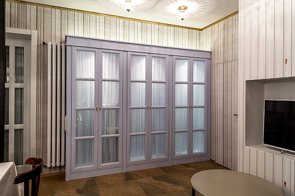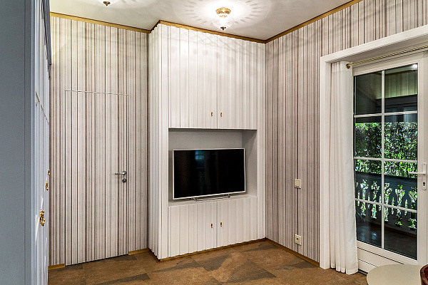 With the help of frescos on the walls, you can create a variety of effects. In the interior of the veranda were used frescoes with a picture of the boards. The volume 3D effect of the drawing made it possible to achieve a feeling that these boards are overlapped. Thanks to this, the walls have acquired depth. The texture of the wood with knots and small scratches, combined with the matte surface of the Velure material, gave the image a realistic look. Frescos are created on seamless canvases, therefore on a plane of walls there is no any joint.
