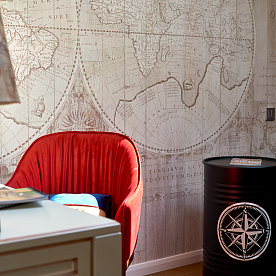 The frescoes of Affresco have become a wonderful decoration of the children's bedroom and playroom in the apartment of Yekaterina Klimova, a well-known actress of theater and cinema. In the kids room a fresco from the collection New Art (Art. RE211-COL1) was applied. A modern collage of graphic elements of old maps was made by artist Alexander Buryatov. The plot is arranged taking into account all the features of the wall, its size and non-standard shape. Background with the texture of the aged board strengthens the sense of dilapidation of the image. Such an individual approach made it possible to express the idea of an ancient map in the modern interior most expressively. In the continuation of the idea of aged boards on the ceiling in the playroom - an individual fresco with the names of three children of the actress, who are prescribed several times different colors and fonts with little scuffs.