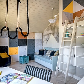 The sleeping area in the nursery for the boy was decorated with an interesting design technique when wallpaper is combined with volumetric elements on one wall. Thus, wallpapers from the Fine Art catalog (art. RE852-COL4) in the Fluid Art color shift technique were combined with a decorative structure in the form of mountains made of painted wooden boards. An abstract multilayered plot with translucent color transitions visually dissolves the wall, creating an airy volumetric form. Gold splashes on the monochrome background of the wallpaper begin to flicker and shimmer like a bright flash, which makes the plot decorative. Conversely, the wood panel construction creates a crisp foreground, enhancing the lightness of the wallpaper plot. This design technique turned the wall into an original art object.
