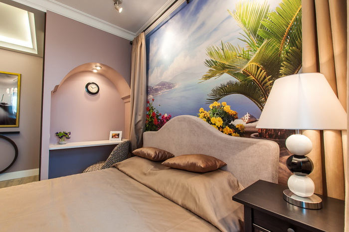 In the new project of “Shkola remonta” every detail of the interior is filled with romance. The main accent of the wall decoration was a seamless fresco picturing the sea view from terrace full of flowers. The fresco was produced specifically for the project, but the image was so beautiful and appealing, that eventually it took its place in Affresco image library (art. 6487). Due to seamless format the fresco looks incredibly realistic. The texture Velatura imitating vast brush strokes brings additional volume to the image. The fresco with the sea view from the balcony widened the space of the room and brightened the calm color solution of the interior.