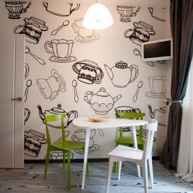 The project for kitchen remodeling shows how dining area was decorated by Affresco fresco. Project Architect Olesya Sitnikova has chosen image for fresco with graphic images of tea set on a light background in black and white. Due to the texture fresco acquired a special lightness and ease. It seems like all items on the fresco floating in weightlessness, and such a composition in combination with the texture gives the room an extra air and space. After completion of the project fresco has become a major focus in the interior, highlighting the living area.
