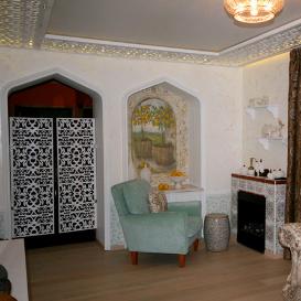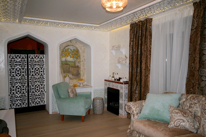 In the project for the living room the niche near fireplace was decorated by Affresco fresco. The fresco picturing lemon trees looks like a window to a beautiful garden. The fresco is produced on texture Velatura imitating vast brush strokes, bringing volume and liveliness to the picture. By adding an extra window the designer of the project made the room look wider and fireplace zone more decorated. The bottom part of the walls was decorated with frescoes on the same texture. The ornaments complemented the oriental interior, making it even more delicate.