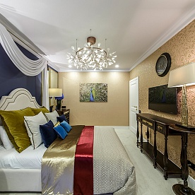 The interior is built on contrasts - the deep dark colors and bright gold, combination of smooth and embossed textures. Accent element in this luxury interior were handmade relief panels Fabrika19 collection (art. 19-3 gold). Classical ornament with smooth contours painted in a beige color with a pearl base and protruding parts of the relief are coated with gold. The result was such a fine oriental color game. The second golden wall is smooth. The background Colore wallpaper (Color300) became a good match with relief panels. In contrast to the smooth dark-blue walls, golden light texture sparkles, makes the interior look rich. A painting of a peacock has become a bright spot of color in the interior and stressed its oriental character.