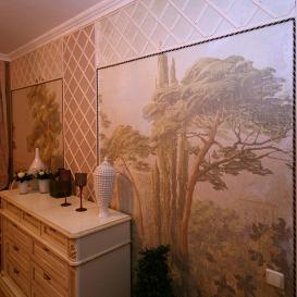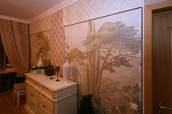 Do landlords participating in the program "Pro Decor," a few years ago already pokleit one leaf wallpaper scene Infinito (art. 1104), and they were with him and now do not want to leave. Despite the time, the wallpaper looked as if they had just stuck. Designers have decided to extend the composition by adding another sheet. Wallpapers Infinito are hand-made in many ways, so the web from different parties joint in a joint glue is not recommended due to possible differences in tone. And the designers decided to glue the second web through the distance, framed canvases, both decorative frames