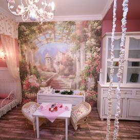 Affresco frescoes can be a perfect solution , because they are durable, eco-friendly, and look incredible. The head designer of “Shkola remonta” chose a fresco picturing magical garden full of roses (art. 6289). To highlight the romance of the interior the colors of fresco were faded a bit, like they are in a fog. The fresco was produced on texture Velatura imitating vast brush strokes. The fresco looks like it was painted directly on the wall.