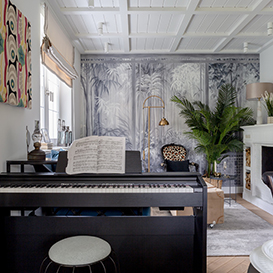 “Living room with a palm tree and a jaguar, colonial notes, barely perceptible American classics, well, like a movie - a lot of dynamics” - this is how designer Ekaterina Gracheva described her project. A monochrome exotic landscape from the VESNA wallpaper catalog (art. AB118-COL2) created the atmosphere of an impromptu gazebo with a view of the tropical forest in the kitchen-living room interior. This effect was achieved by combining architectural elements in the foreground with a forest landscape stretching into the distance. The panoramic composition of the drawing expands the space of the room, and the translucent strokes of the watercolor painting technique bring lightness and airiness. The wallpapers were made on Velure texture individually to the size of the wall. The drawing was adjusted for the project - the central arch was expanded so that it was better read in the interior.