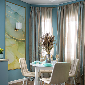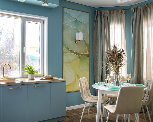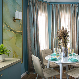 Two decorative panels from the Fine Art catalog (art. RE845-COL1) with an abstract pattern using the Fluid Art technique have become an original decoration of the kitchen dining area. The drawing seems to dissolve the border with the wall, adding volume and delicate colors to the room. The wallpaper was made on Velure with a thin, slightly velvety plaster layer. The wallpaper is strong enough and can be washed as needed, which is especially important for the kitchen.