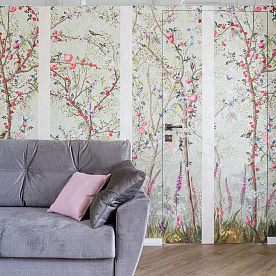 Chinoiserie-style wallpaper from the Atmosphere catalog (art. AF501-COL1) created the atmosphere of a blooming garden in the living room. The wallpaper was designed by artist Alexander Buryatov. Every detail of the plot - from luxurious inflorescences and birds to the smallest blades of grass - is spelled out by the author with the utmost scrupulousness. The color scheme is balanced according to all the laws of the interior colorist, so the composition looks very harmonious and unobtrusive. The ceiling height in the room is only 230 cm. In order to visually expand the space and raise the height of the walls, the canvas was divided into fragments, which were glued at a certain distance. This technique made it possible to create the feeling of an impromptu panoramic window or gazebo overlooking a luxurious garden. The wallpaper was made on a new material Colore Light - a slightly porous texture with a light mother-of-pearl. On this texture, the colors begin to shimmer with pearl shades. Light mother-of-pearl also adds light to the room.