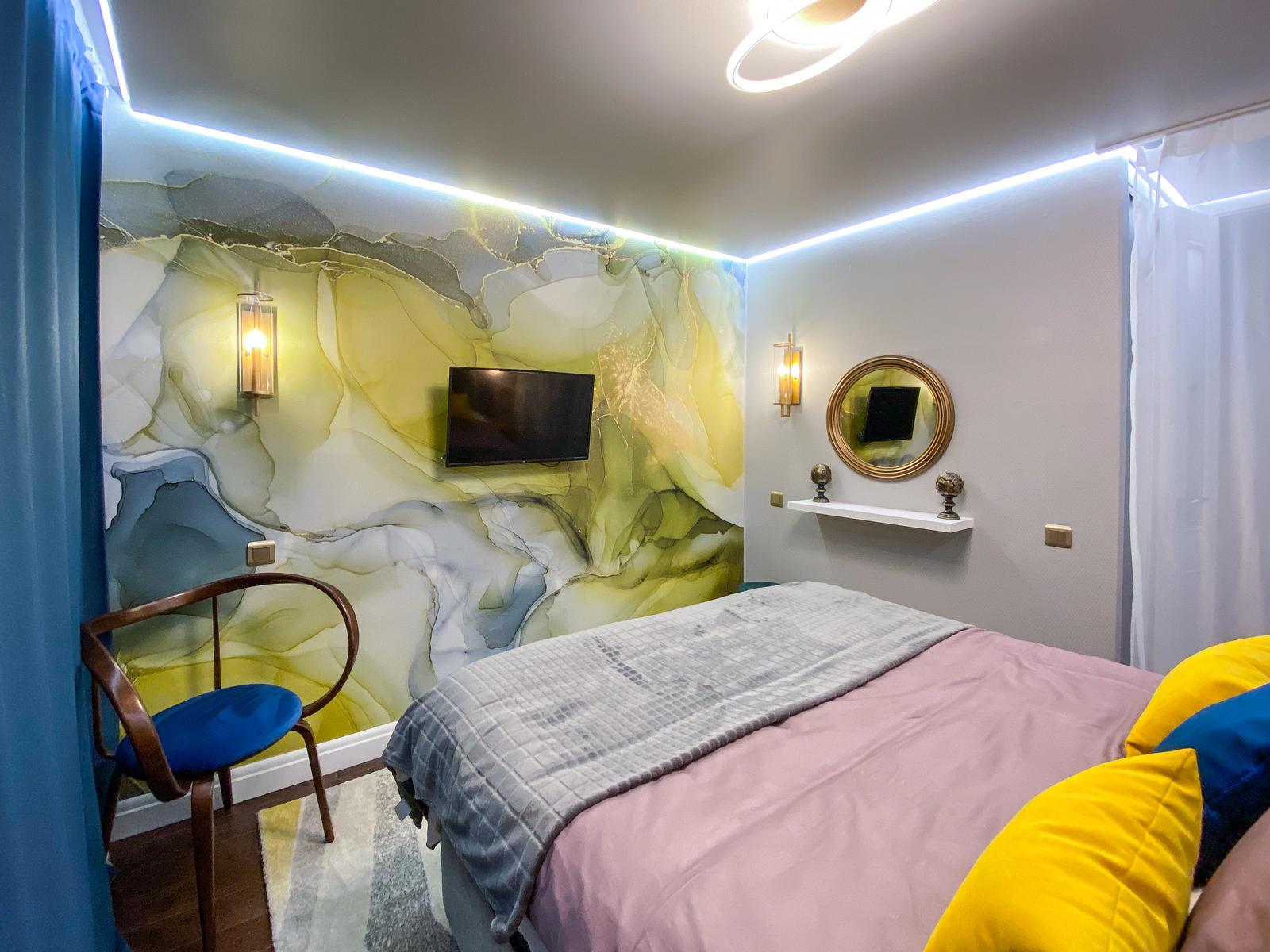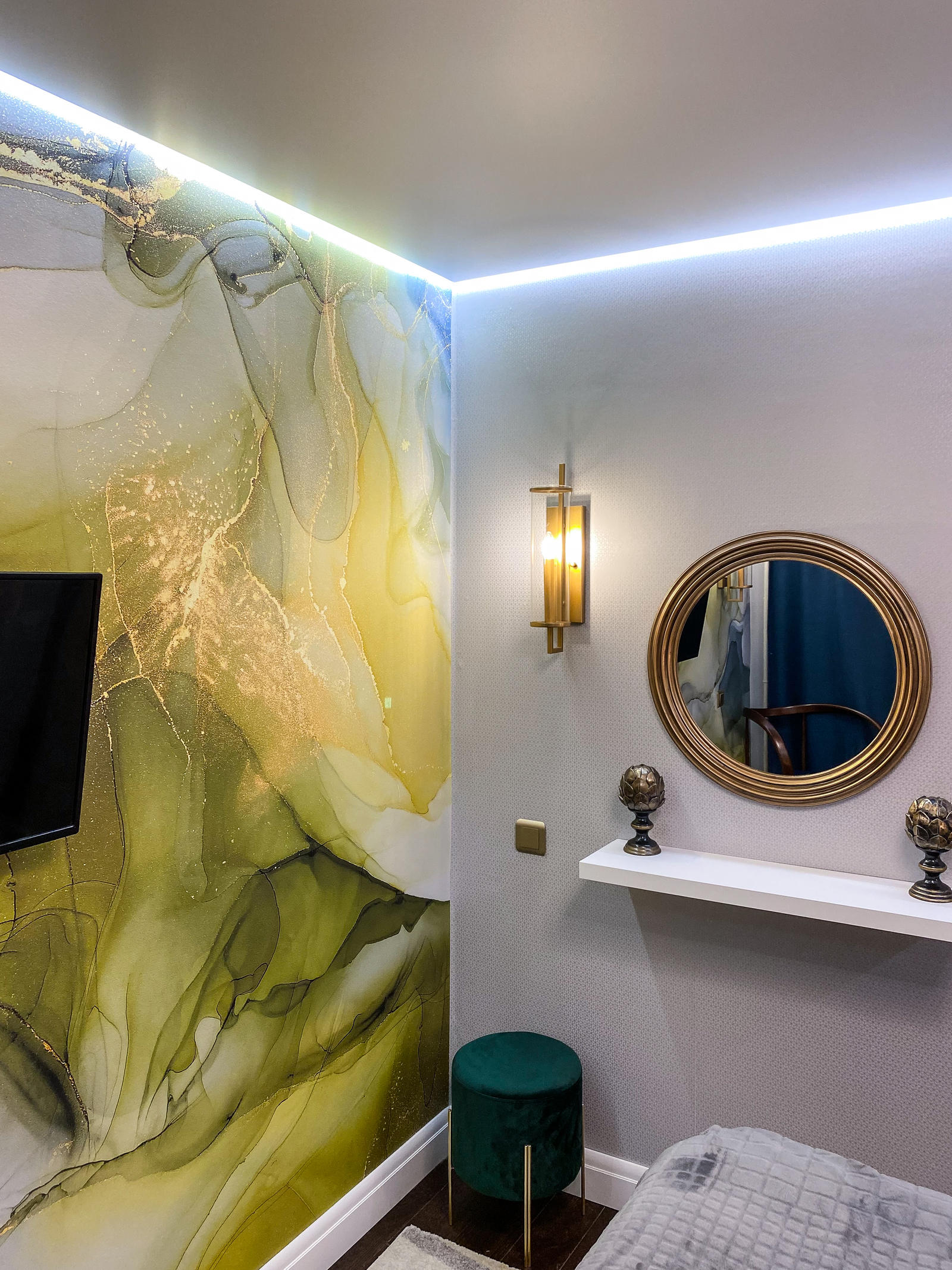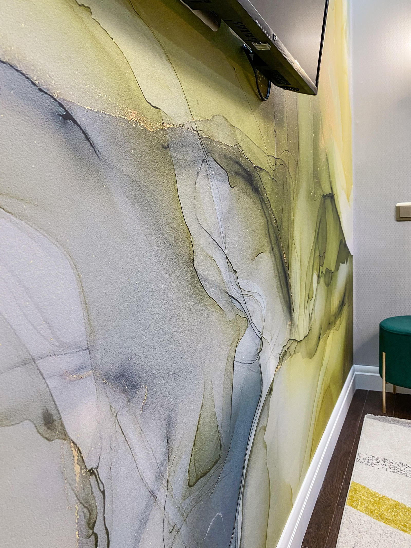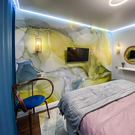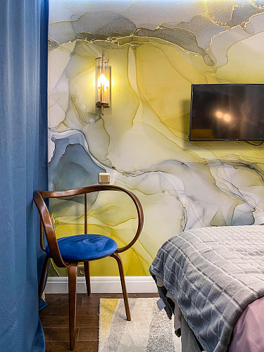 Fluid from the Fine Art catalog (ref. Re852-col1) became the basis for creating a modern bedroom interior and its main accent decor. The drawing was made in a very popular color mixing technique - "Fluid Art". It seems to dissolve the border with the wall and add volume to the room. The Fine Art collection fluids are able to endlessly excite the imagination, filling the interior with a mysterious atmosphere. For all articles, the catalog offers up to five different color variations from Affresco artists.