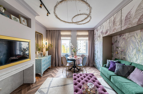 Wallpapers from the VESNA catalog (art. AB120-COL1) with a plot of delicate wildflowers and herbs have become an effective accent of the interior of the living room in the Provence style. The wallpaper was mounted both on the wall and on the doors of a large-scale storage system to combine them into a single decorative composition. This solution is especially relevant for small living rooms that require a large number of storage places, so that the interior remains elegant and the cabinets are invisible. The romantic floral décor brought incredible lightness to the living room interior while completely hiding many convenient storage areas. Especially for the project, on the instructions of the designer Marina Poklontseva, the background color and some of the plants were finalized and approved according to preliminary color proofs.