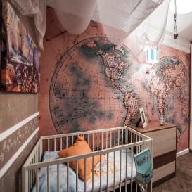 In “Pro décor” project to decorate bedroom area for a child the main accent was a fresco by Affresco. The whole wall more than 5 meters wide was covered with a fresco picturing an old world map. The texture Patina with natural porcelain cracks make the image look slightly old. The fresco is covered with protective varnish, with which the fresco is resistant to small mechanical damages and can be washed. Seamless format will save the characteristics of fresco for a long time, because the child won’t be able to damage it.
