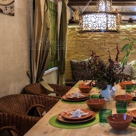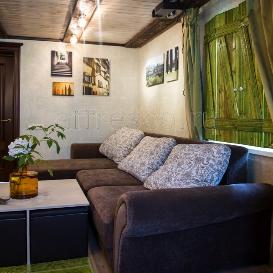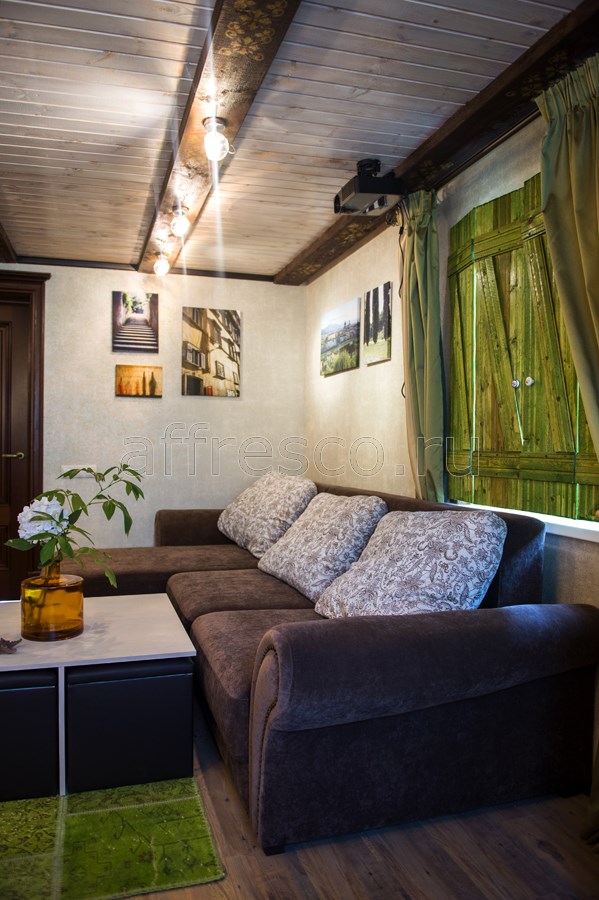 Remodeling the living room in a country house designer has used seamless background FabriKa19 panels of decorative plaster on a flexible non-woven basis. The inhomogeneous surface of gentle olive background with beige splashes made the color deep and elegant. Mother of pearl combined with a slightly porous surface relief gave the background shade depth and volume. All the walls were decorated with seamless coverings which made possible to achieve perfectly flat plastered surface. Background FabriKa19 coverings are very durable, water-resistant, non-fading, and their flexible texture prevents from cracking.