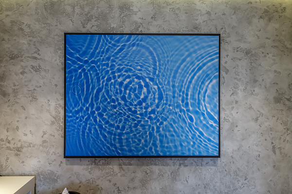 City interior with plaster imitating concrete was balanced by bright pure colors of a painting by Affresco. The image of clear blue water looks deep and fascinating. Slightly velvety texture Velure matched the theme perfectly. The borders of painting are almost black and look like a frame, which highlights the picture on the background of concrete wall and fit perfectly in the rest of the interior.