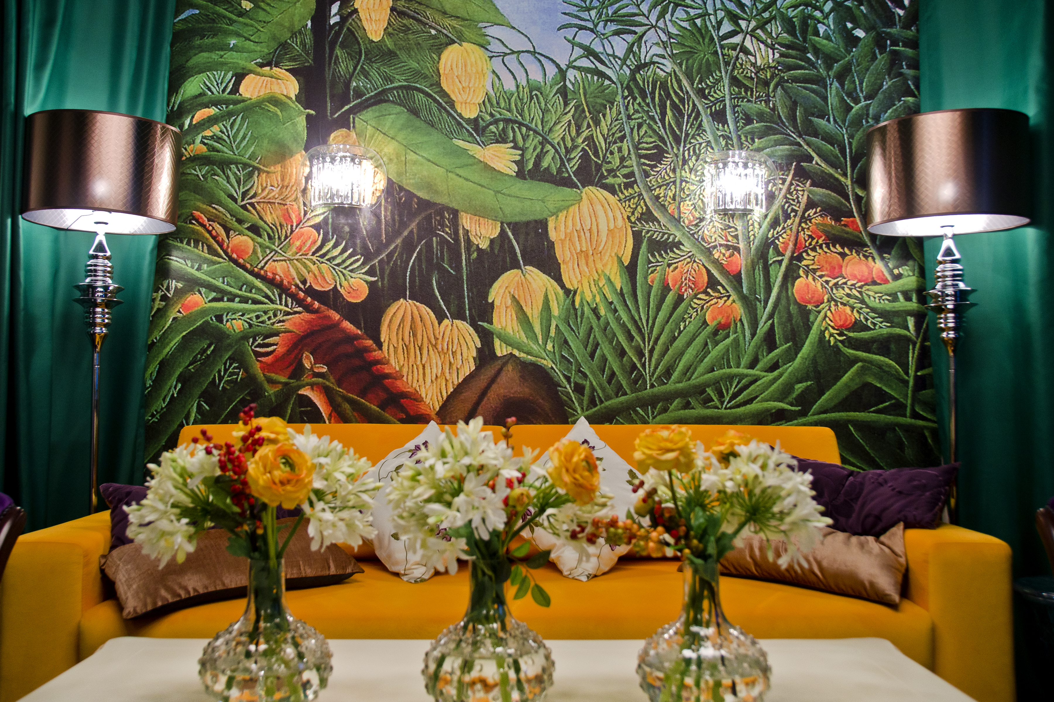 In the new program "Chistaya Rabota" designer decided to create the interior of bright contrasting colors of a tropical jungle. The main accent of the expressive style of the interior is Affresco fresco, created from the reproduction of paintings by the famous French painter Henri Rousseau, an enthusiastic nature and tropical jungle themes lover. Size of seamless fresco is 2.6 x 2.6 meters, so Affresco designers worked on the original image to produce it in such a large format and keep the quality. Slightly porous Beze texture of frescos give the image volume and depth by the play of light and shadow and stress the strokes.