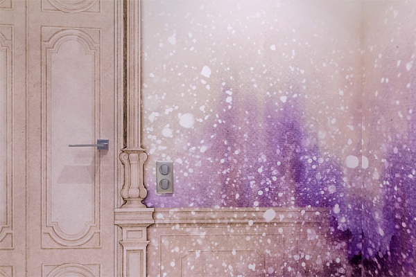 The created interior turned out to be surrealistic “sleepy kingdom”, full of illusions, with mild lighting and elegant images of architectural elements looking incredibly real. This brilliant performance of designer’s ideas was achieved by the frescoes covered almost the whole room with one theme. A seamless fresco was produced for each wall according to custom dimensions to avoid joints on the walls. The image floats from one wall to another creating an eternal picture. The sketch was made very precisely to make the drawn door fit the real one. An abstract image makes you feel like in another universe, covering the room with light foggy ambience. Matte and slightly rough Velure texture makes the frescoes look even more sophisticated.