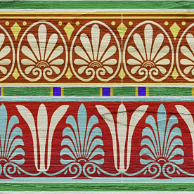 Decorative frescoes are glued absolutely on any surface, so they can decorate not only ceilings and walls, but also other interior elements: doors, furniture or, for example, in the new project of the Fazenda program - the frieze of a multifaceted wooden roof. To make the frieze harmoniously tied with the stylistics of the wooden plating, the ornament was added with the texture of the wooden board. The length of the canvas, more than 10 meters, has allowed to avoid numerous joints, so the picture looks complete and natural, as if this frieze was painted directly on wooden boards.
