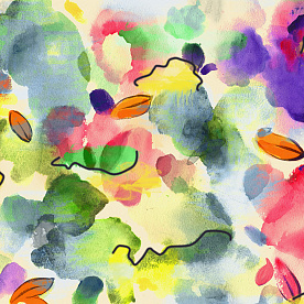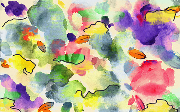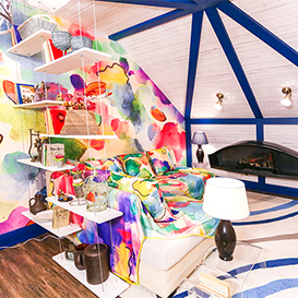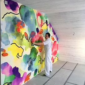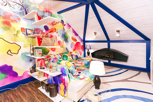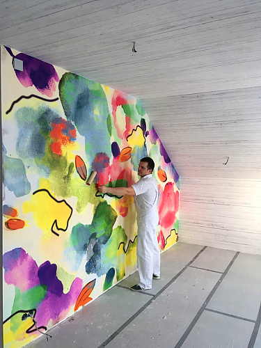 You will see how to use Affresco frescoes with imitation of aged wood for decoration of slopping walls of the attic, without reducing its height. To achieve this individual sketch was made, taking into account all the parameters of the complex geometry of the room. Creating a sketch, Affresco designer put the board of the desired width in needed directions. Wood boards were worked through in the way it look realistic, with snags and nails. A layer of plaster as a part of the frescoes protects the image, making it durable and moisture-resistant. Frescoes texture Beze with little relief shows a wood texture. The entire project is built on contrasts and one of the gables decorated with bright abstract mural image in watercolor painting technique. Velure Texture with their matte, velvety surface accurately present the surface of the canvas for watercolor painting.
