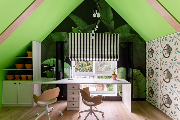 The designer's idea to create a real jungle atmosphere in the nursery was supported by frescoes with large palm leaves, which were located on the pediments of the attic. The doorway was also hidden behind the fresco. Palm leaves look very voluminous in the interior, as if falling out of the wall. This effect is achieved due to a certain composition of the drawing of the play of light and shadow. The design from the French Garden wallpaper catalog, art. AF956-COL2. The designers of the factory changed the background color to a darker one and thinned the leaves, removing them in the right places according to the instructions of the author of the project. Also, an individual size was set for the canvases, which were cut to the shape of the inclined walls of the attic during installation. The fresco consists of environmentally friendly materials: non-woven fabric, mineral plaster and natural color pigment. This is especially important for children's rooms. Despite the environmental friendliness, the frescoes are quite durable and, if necessary, they can be wiped with gentle detergents. Also, elastic canvases are capable of hiding microcracks behind them, which can eventually appear in the house during shrinkage or sudden changes in temperature.