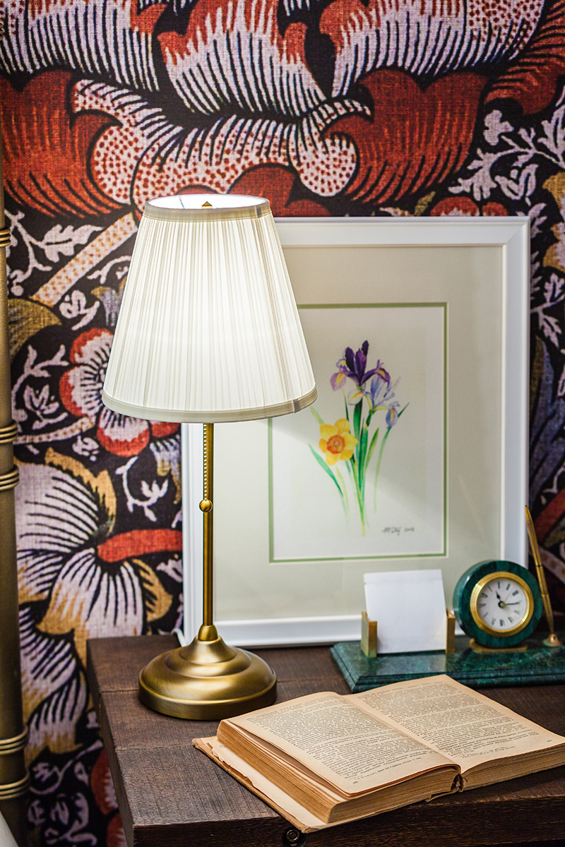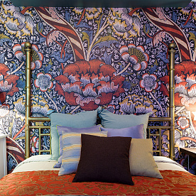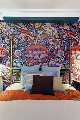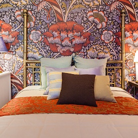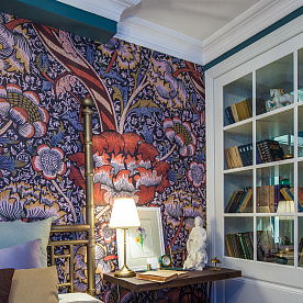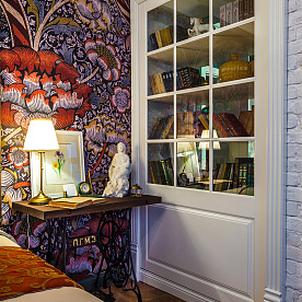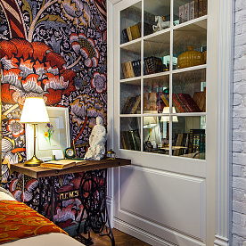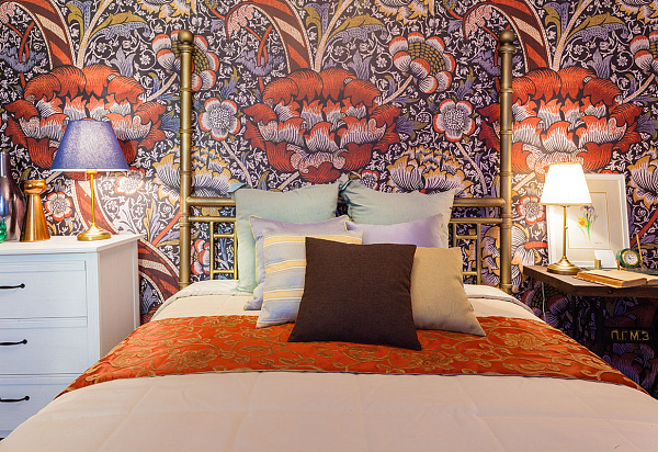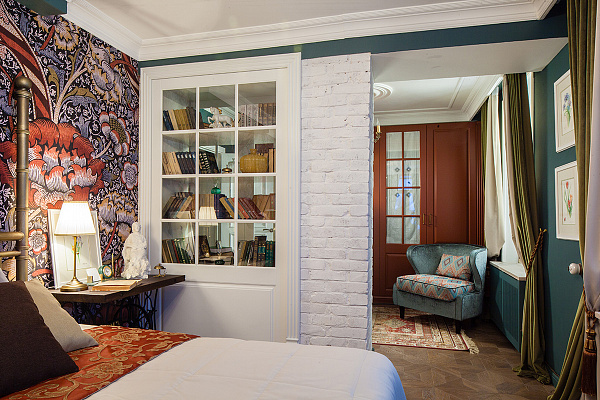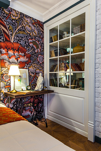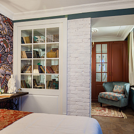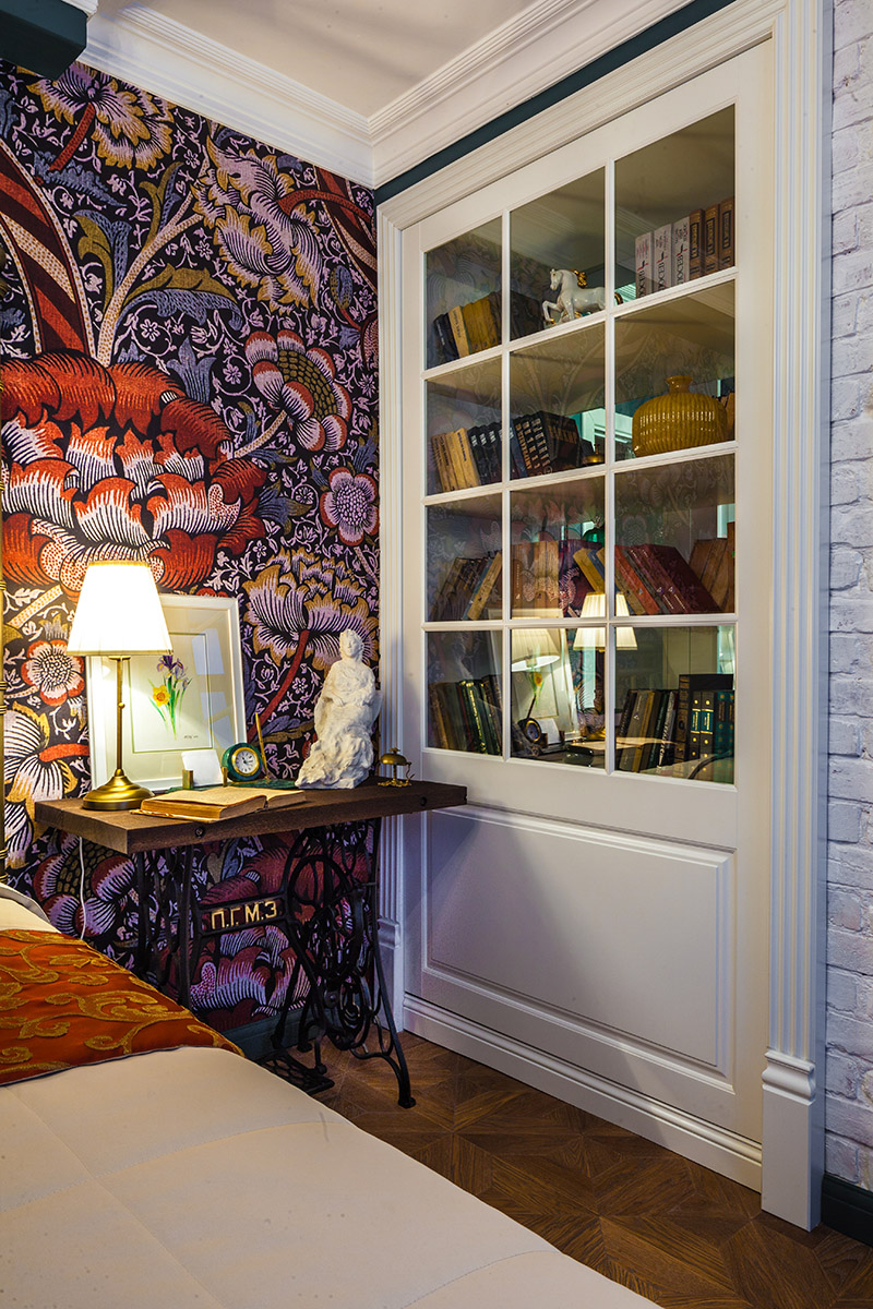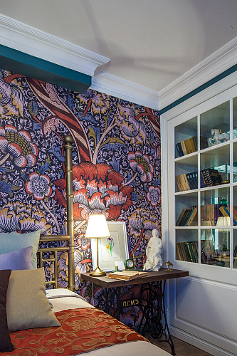 The author of the project managed to express the atmosphere of the historic house, which is already 170 years and were visited by classical Russian composer Pyotr Tchaikovsky, and such complicated task was solved very professionally and sensitively. A zone over the bed was decorated with a fresco with repeating floral patterns. Deep and intense color pattern became harmonious background for the hosts’ antiques and luxury three-dimensional flowers turned out to be a wonderful decoration of the interior. Seamless panels was prepared by individual size. The image was adjusted by height of the headboard to show the large flowers most clearly. The result was an incredibly friendly modern interior looking like it was created back in the nineteenth century - and this is expressed by the professionalism and skill of its author.