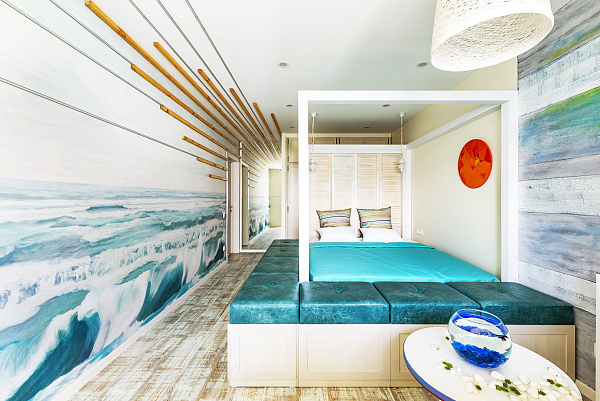 Turn one of the walls of a Moscow apartment into a view of the seething waves of the sea was made possible by the fresco. Designer Affresco took as a basis the seascape of the artist Alexander Buriatov from the Dream Forest collection (Art.N. KN44-COL2) and adjusted it specially for the project, setting the desired height of sea level (130 cm from the floor) and removing the plants from the foreground. Thanks to the broad strokes of the author, the waves look very dynamic and create a sense of continuous movement, expanding the space of the room. To ensure that the plot looked as realistic and complete as possible, the seamless cloth glued to the whole wall, and only then the doorway cut through the contour. Matte and slightly velvety layer of plaster gave the plot a naturalness and nobility.