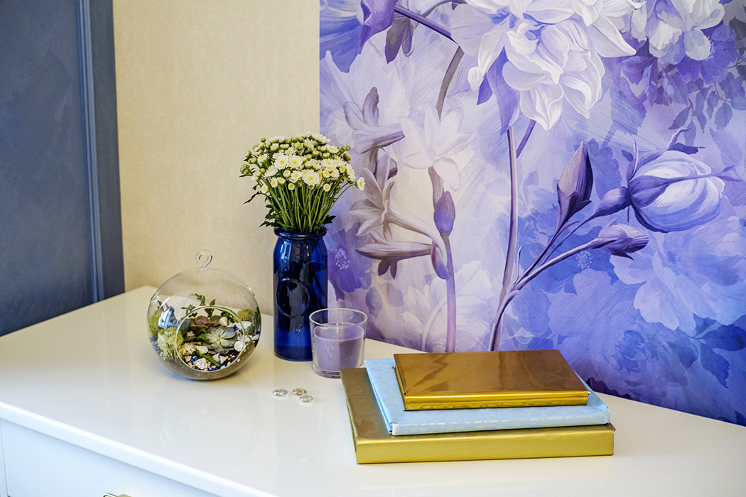 Bright and ideological accent of the new interior of the living room was a fresco with floral motifs according to the scenes of the wallpaper TSVETARIUM (Art., Flower festival Color 2). The drawing, made in the watercolor technique with the finest color transitions, on the canvas of the fresco is indistinguishable from the hand-painted. The rest of the walls were decorated with seamless wallpaper sandy colors, which were created using the same technology with fresco using plaster. To achieve a more aesthetic appearance, the Affresco designer assembled both a floral panel and a background frame on a single canvas of the fresco. The absence of joints on the plane of the walls made it possible to achieve the effect of a uniformly plastered surface. Almost without relief Velvet's velvety surface has been applied to both the fresco and the background extras, so they perfectly complement each other.